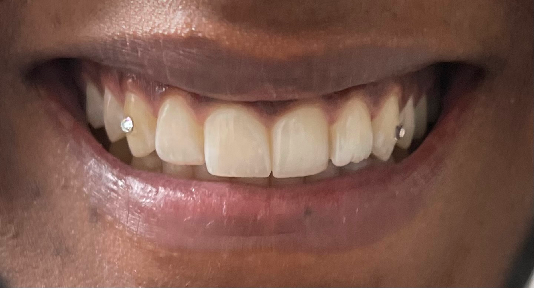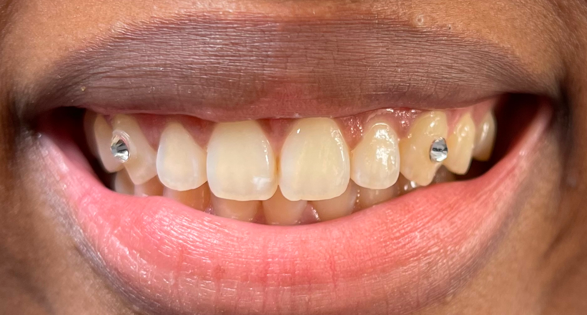 Two perfectly placed tooth gems catch the light beautifully, adding just the right amount of sparkle without being overwhelming. The gems are securely bonded to the enamel using safe dental adhesive and can be easily removed whenever desired. This subtle bling gives their smile a unique, fashion-forward look that's perfect for special occasions or everyday confidence.